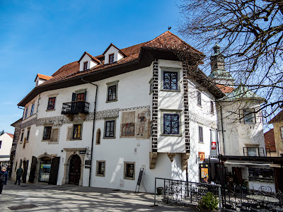 Najlepši detalj na Gradskom trgu, i jedan od dva u celom gradu, je Homanova kuća. Nalazi se na samom početku, prema Cankarjevom trgu, odakle smo došli. U pitanju je građanska vila napravljena ili restaurirana neposredno posle već pomenutog zemljotresa 1511. godine u gotskom stilu sa elementima renesanse. Pri skorašnjoj restauraciji otkrivene su freske srednjevekovnog ratnika i Sv. Kristofera i još neki detalji koji su sada istaknuti na obnovljenoj fasadi. Piše da predstavlja spoj tri zgrade tako da je moguće da ceo kompleks ograničen trouglom ulica koji izlazi na dva pomenuta trga predstavlja Homanovu kuću. Ipak najlepša je fasada okrenuta ulici koja spaja trgove, što ćete bez problema prepoznati. Ispred kuće je bašta kafane sa 150 godišnjom tradicijom kojoj hlad pruža ogromna lipa. Tu smo u povratku svratili na kafu. Tek kasnije smo saznali da je to i poslastičarnica. Bitna informacija za sledeći dolazak...